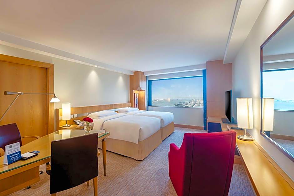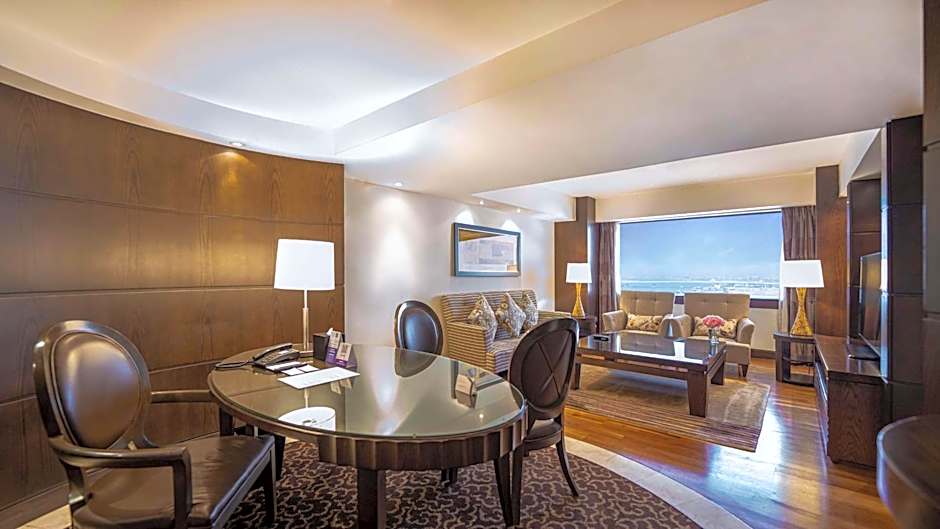 Featuring panoramic views of the Arabian Gulf, this 35 sq.mt room has rich, modern style with hardwoods, marble and natural earth tones. Deluxe amenities include king or twin bed with extra-large pillows, large work area with high-speed internet access, marble bath with glass mosaic accents, bathrobe and slippers. Access provided to the fitness center, pool, spa, sun deck, jogging track, tennis and squash courts, free Wi-Fi, free beach transfer.